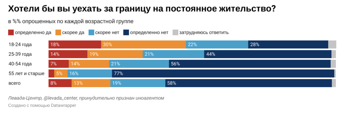 Согласно опубликованным данным опроса, доля желающих уехать растет и молодеет.