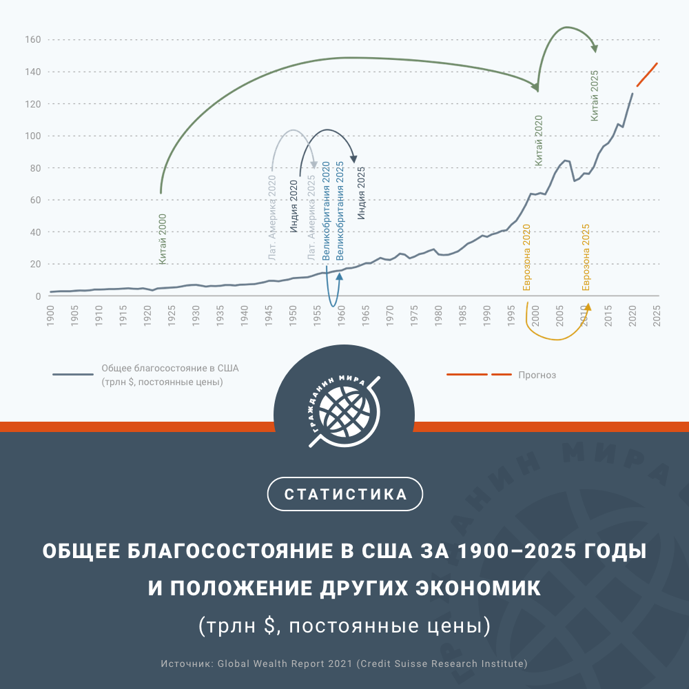 Ежегодно богатство домохозяйств в США увеличивалось в среднем на 3,3% с 1900 по 2020 год. Положение Еврозоны, Латинской Америки, Великобритании, Китая и Индии в исторической перспективе сильно отстаёт.