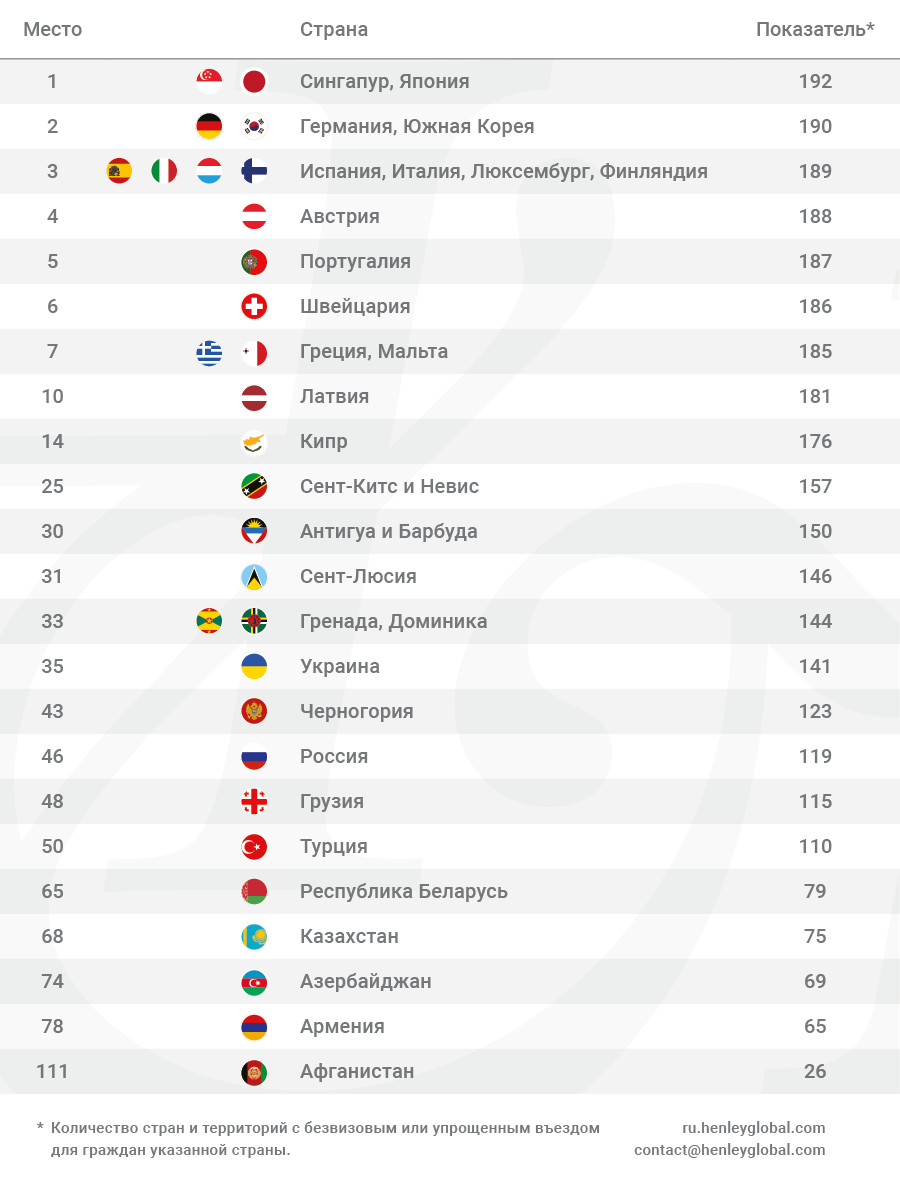 Россия и страны СНГ изменили свои позиции за квартал наблюдений несущественно. Движения в рейтинге были также обеспечены изменениями в позициях других стран. Россия приобрела безвизовый доступ к Пакистану и переместилась с 51-го на 46-е место в рейтинге. Обладатели российского паспорта могут в теории путешествовать по 119 направлениям без визы.