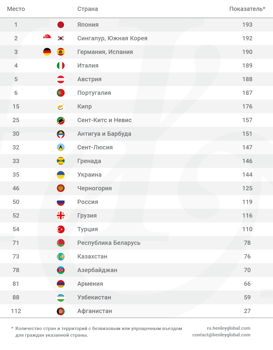 Япония занимает первое место в Индексе по числу безвизовых направлений (или с визой по прибытии), открытых для держателей паспортов этой страны — 193. Сингапур и Южная Корея заняли второе место с результатом 192 безвизовых направлений.