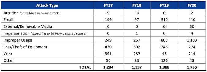 Обнаруженные кибератаки были самыми разными: брутфорс, атаки на электронную почту, атаки с подделкой личности, потеря и кража оборудования, различные веб-атаки и инциденты, связанные с внешними или съемными носителями. В 2020 году большинство инцидентов было связано с некорректным использованием, включая установку несанкционированного ПО или доступ к неуместным материалам.