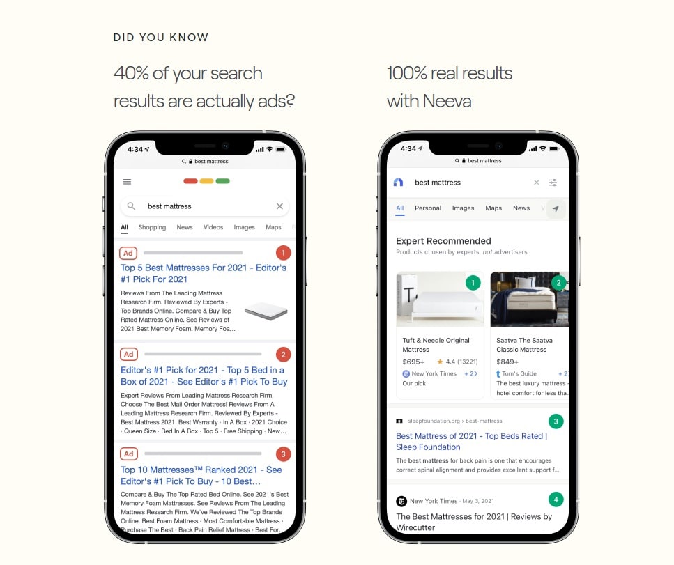 Бывшие сотрудники Google Шридар Рамсавами и Вивек Рагунатан, оба связанные с рекламным бизнесом компании, основали свой поисковик под названием Neeva. В 2020 году Шридар, занимающий пост главы рекламного бизнеса Google, высказался о том, что менеджеры в погоне за "рекламными деньгами", совсем забыли о конечном качестве продукта.