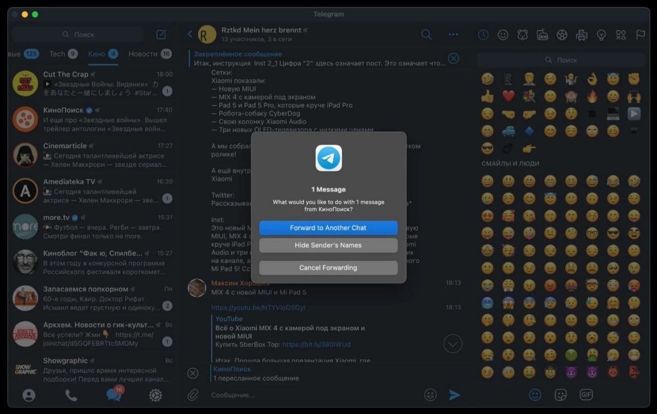 В Telegram Beta 7.9 (номер сборки 220594) для macOS появилась функция пересылки сообщения другим пользователям без указания имени автора самого сообщения. Ожидаем новую фичу для всех платформ.