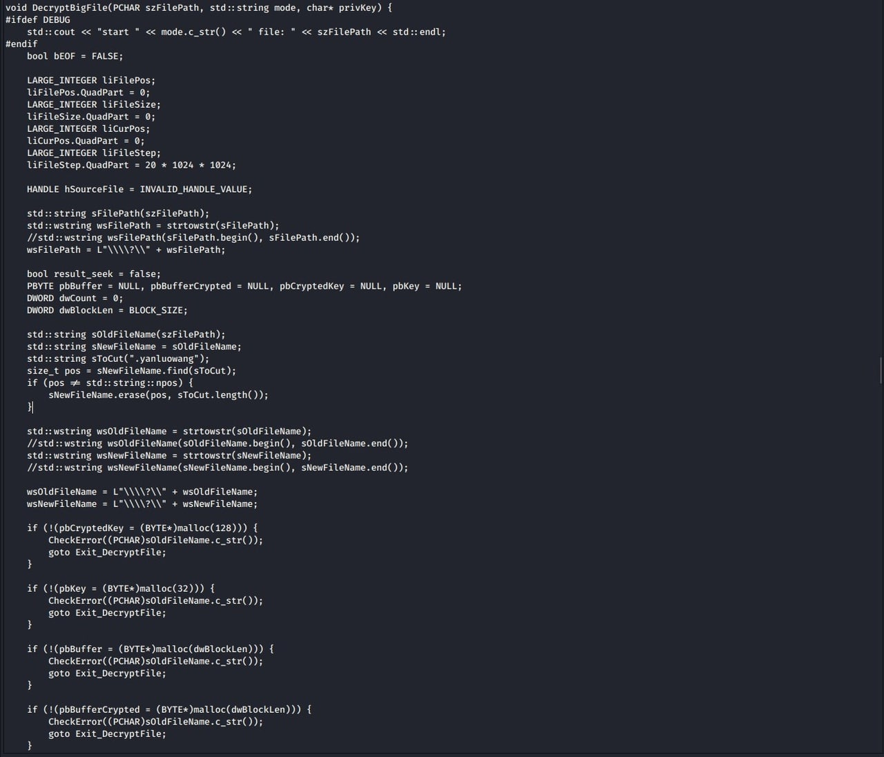 Помимо логов в сети можно найти даже скриншоты, содержащие исходный код процедуры дешифрования вымогателя Yanluowang.