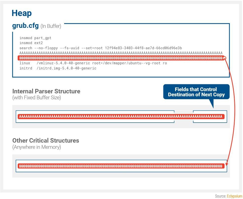 Для осуществления взлома достаточно внести изменения в файл grub.cfg, чтобы повлиять на процесс запуска ОС путём переполнения буфера GRUB2. Примечательно, что такая интеграция происходит на уровне физической памяти материнской платы, поэтому даже полная переустановка операционной системы не позволяет избавиться от хакерского кода в загрузчике.