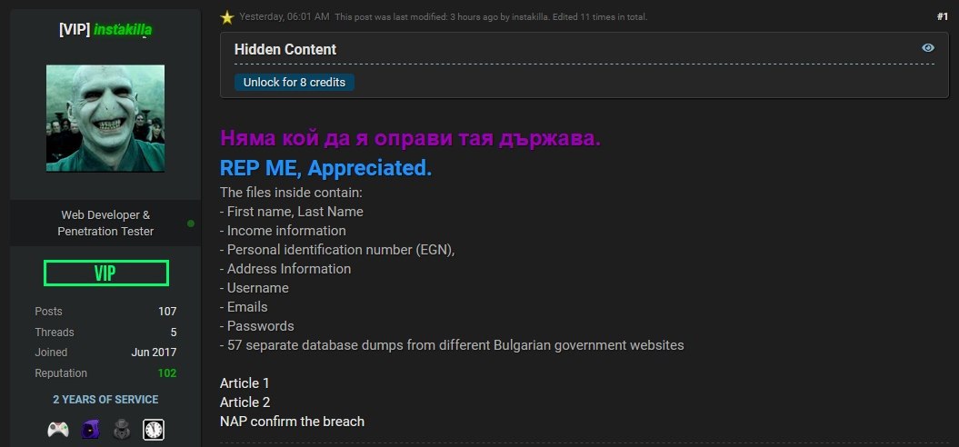 Instakilla активен примерно с 2017 года, хотя широкую известность он получил лишь в прошлом году. В 2019 году Instakilla слил в сеть информацию, похищенную у Национального налогового управления Болгарии, хотя он и не принимал непосредственно участия в самом взломе. Также хакер скомпрометировал официальные форумы Comodo. В текущем году Instakilla связывали с крупным взломом форумов Stalker Online, откуда он похитил более 1,2 млн пользовательских записей, которые затем выставил на продажу на хакерском форуме. На этом же форуме злоумышленник продавал похищенные у компаний данные. В итоге Instakilla забанили на этом форуме за мошенничество. Также у преступника был собственный сайт, где он предлагал свои хакерские услуги всем желающим.