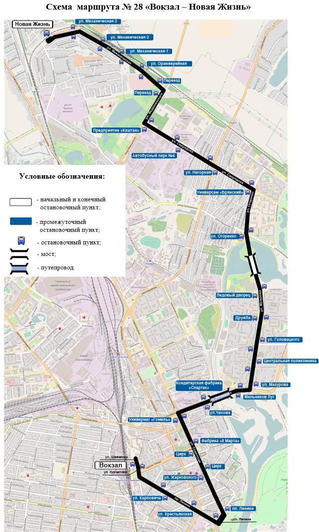 На время закрытия автобусный маршрут № 28 «Вокзал — Новая Жизнь» будет осуществлять движение по улицам Советская, Хатаевича, Мазурова и далее по маршруту в обоих направлениях. Время отправления от начальных ост. пунктов остается без изменений.