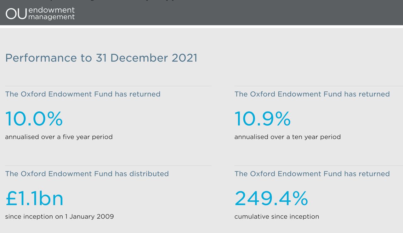 Курс по финансам ведет Jack Edmondson — до недавнего времени он возглавлял Oxford University Endowment Management. OUEM — отдельная организация, которая управляет финансовыми активами университета. На текущий момент эндаумент составляет около 7 миллиардов фунтов стерлингов. У него есть сайт https://www.ouem.co.uk/ с отчетностью и планами. За последние 10 лет средняя годовая доходность составила ~11%.