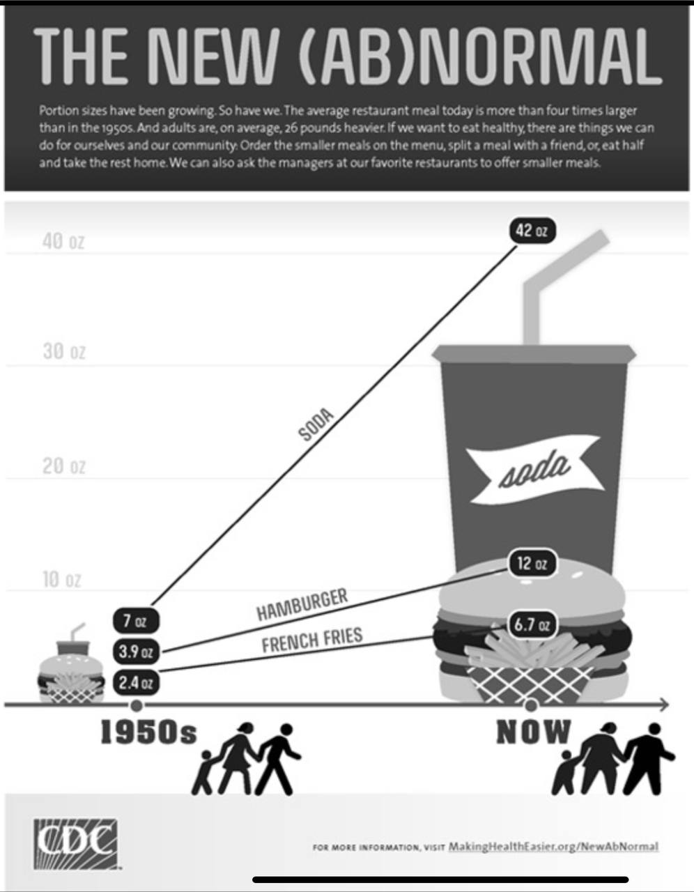 На картинке показано как с 1950-х годов в американских фастфудах средний размер порции вырос в 4 (!!) раза. Стали ли люди рационально заказывать самые маленькие блюда или делить бургер на четверых? ))))