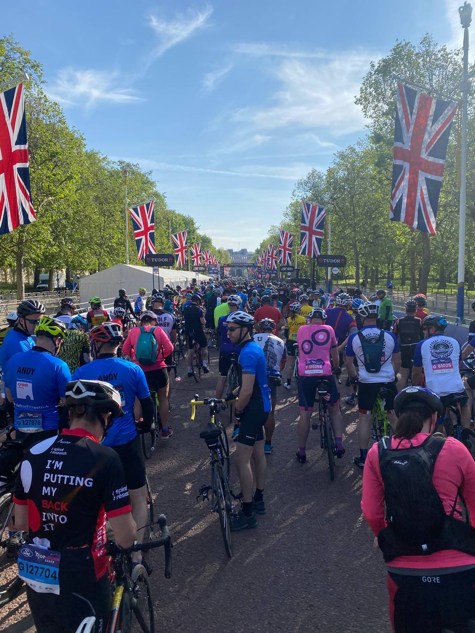 Ивент делают организаторы Лондонского марафона. Логистика и безопасность для 25 000 велосипедистов это серьезный квест 🙂 Мы добирались от входа в стартовый городок до линии старта больше часа (около 3 километров лабиринтов с указателями и разделением потоков). Старт начинается с 6 утра и длится до 10. Первые волны уже успевают приехать 🙂