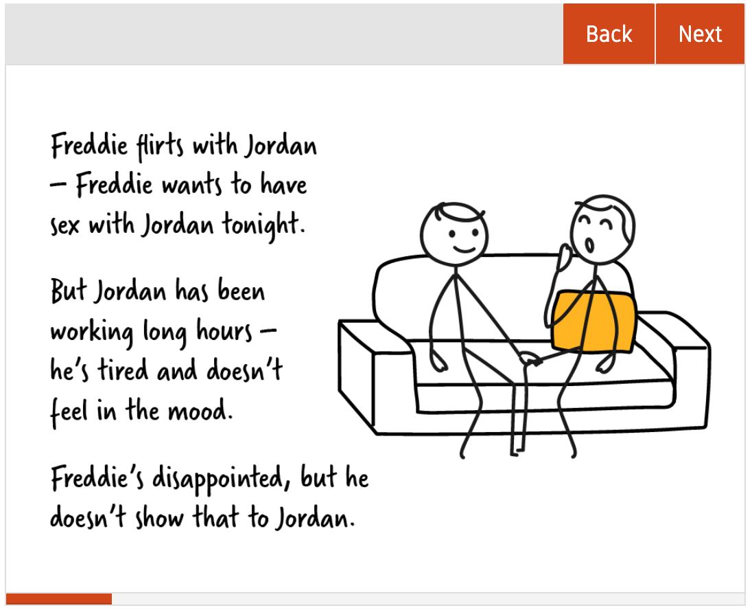 Курс, конечно же, гендерно равный, поэтому в смоделированных ситуациях есть и гомосексуальные пары (как на картинке про Фредди и Джордана 🙂
