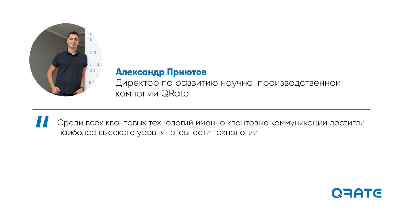 — Cреди всех квантовых технологий именно квантовые коммуникации достигли наиболее высокого уровня готовности технологии, – отмечает директор по развитию научно-производственной компании QRate Александр Приютов. – Например, в России уже появились первые сертифицированные решения, ведется серийный выпуск изделий класса ККС ВРК (квантово-криптографические системы выработки и распределения ключей). Поэтому для сведений, не составляющих государственную тайну, мы можем смело говорить о «боевом» применении квантов. Стоит подчеркнуть, что помимо угрозы со стороны квантовых компьютеров, квантовые коммуникации решают еще более актуальную проблему – человеческий фактор. Даже если бы мы никогда не увидели квантовые компьютеры, исключение человеческого фактора – достойная и достаточная мотивация рассмотреть применение решений, базирующихся на данной технологии.