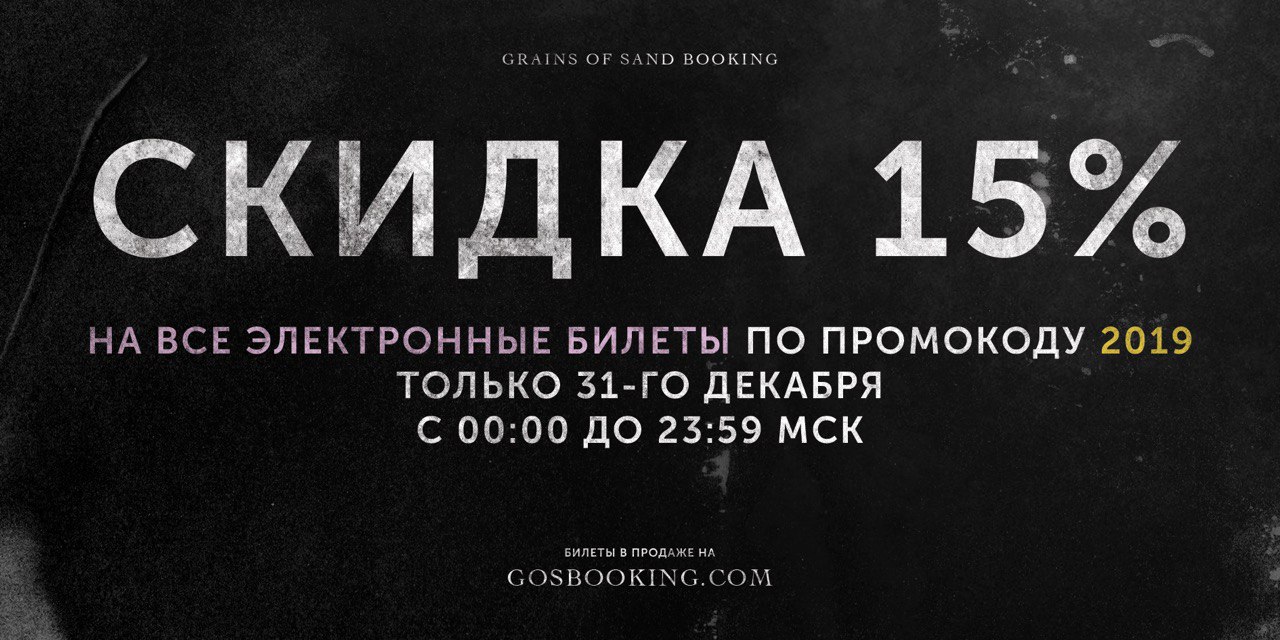 Друзья, в честь наступающего 2019 года 31-го декабря с 00-00 до 23:59 вы сможете приобрести билеты на все наши мероприятия со скидкой 15% по промокоду "2019".