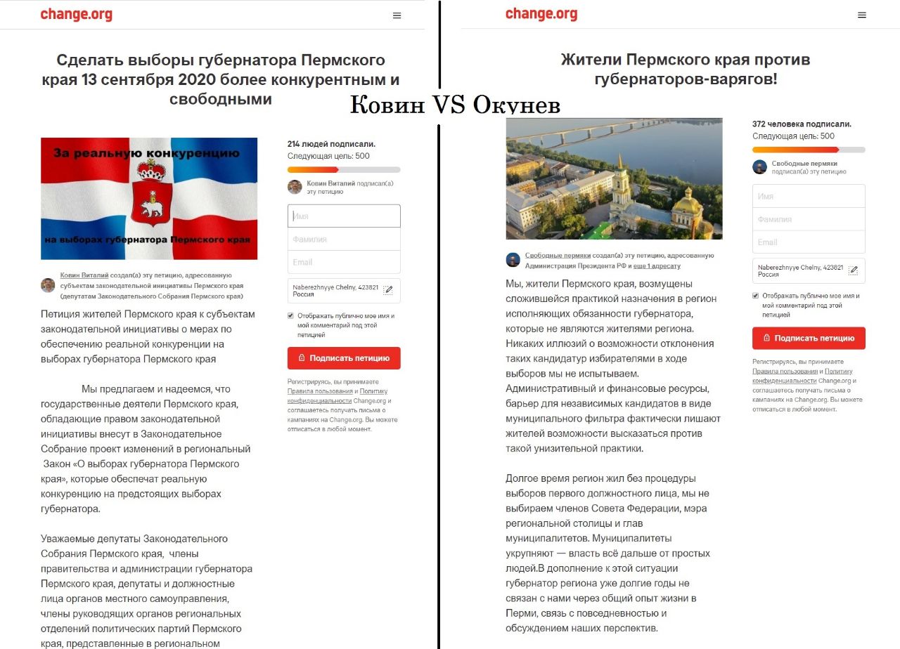 Что еще кроме хомок, которые бегают за машинами S класса с яблокофонами в надежде правильно и четко сфотографировать номерной знак (спойлер: это получается далеко не всегда)?А,вот: оппозиция под крылышком el comandante создала петицию свободных от варяг пермяков. Замутили они ее, потому что любитель поснимать чужих детей из окна своей квартиры и немного сотрудник РАН Виталий Ковин чуть раньше наваял аналогичный шедевр "За реальную конкуренцию", но он по какой-то причине не удовлетворил опальных политиков. Теперь две петиции, созданные кропотливым трудом оппозиционеров,соревнуются за право определять тенденции электоральных процессов в Пермском крае. Пока выигрывает петиция Окунева-Агишевых,возможно потому что ЛГБТ-сообщество еще не в курсе существования талантливого политолога, а адрес "последнего приюта депутатки" им хорошо знаком.