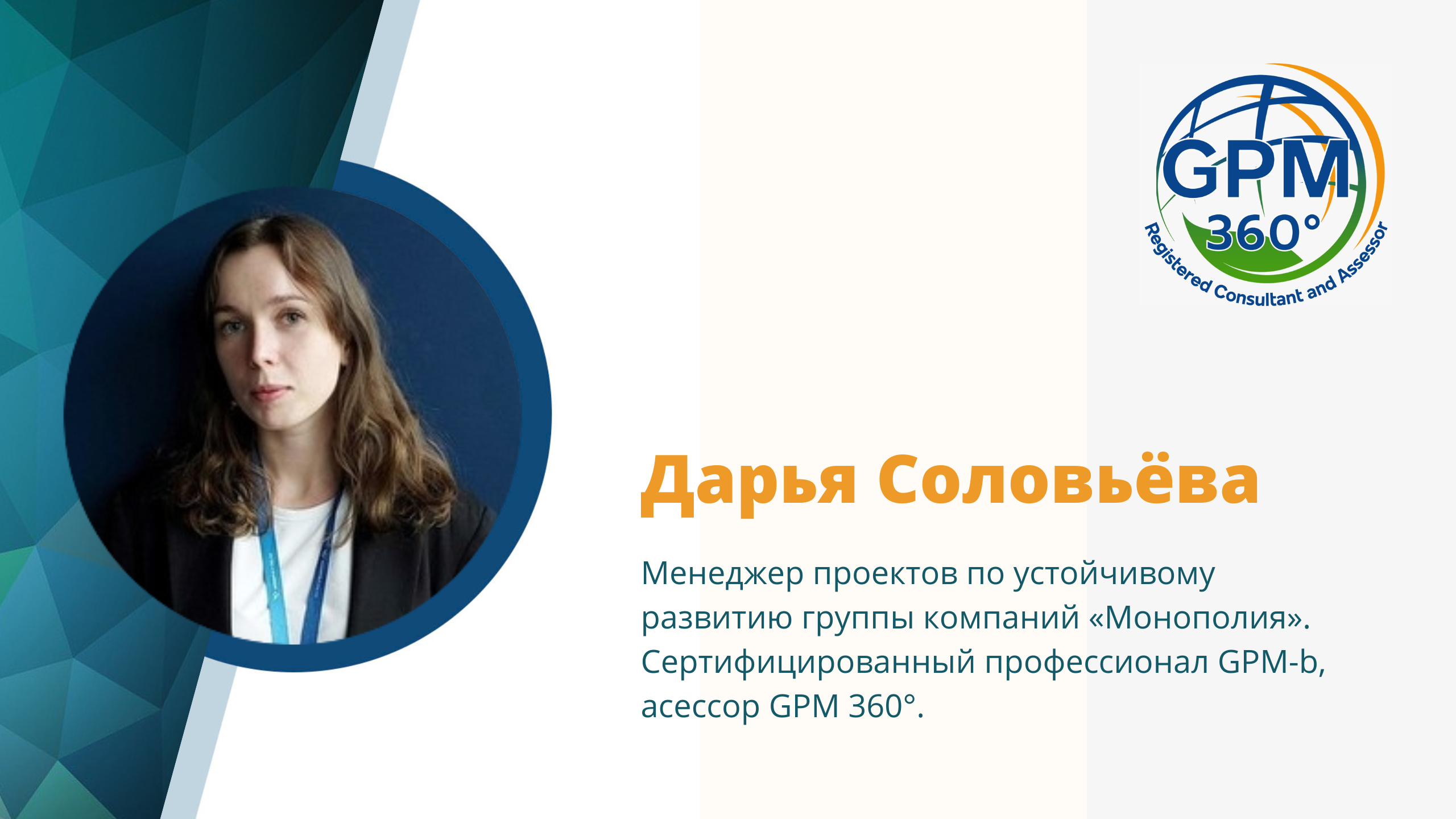 Менеджер проектов по устойчивому развитию группы компаний «Монополия», сертифицированный профессионал Green Project Management (GPM-b) Дарья Соловьёва рассказала о впечатлениях от профильного курса для кандидатов претендующих на звание Международного консультанта – асессора по оценке и сертификации проектов по системе GPM 360°.