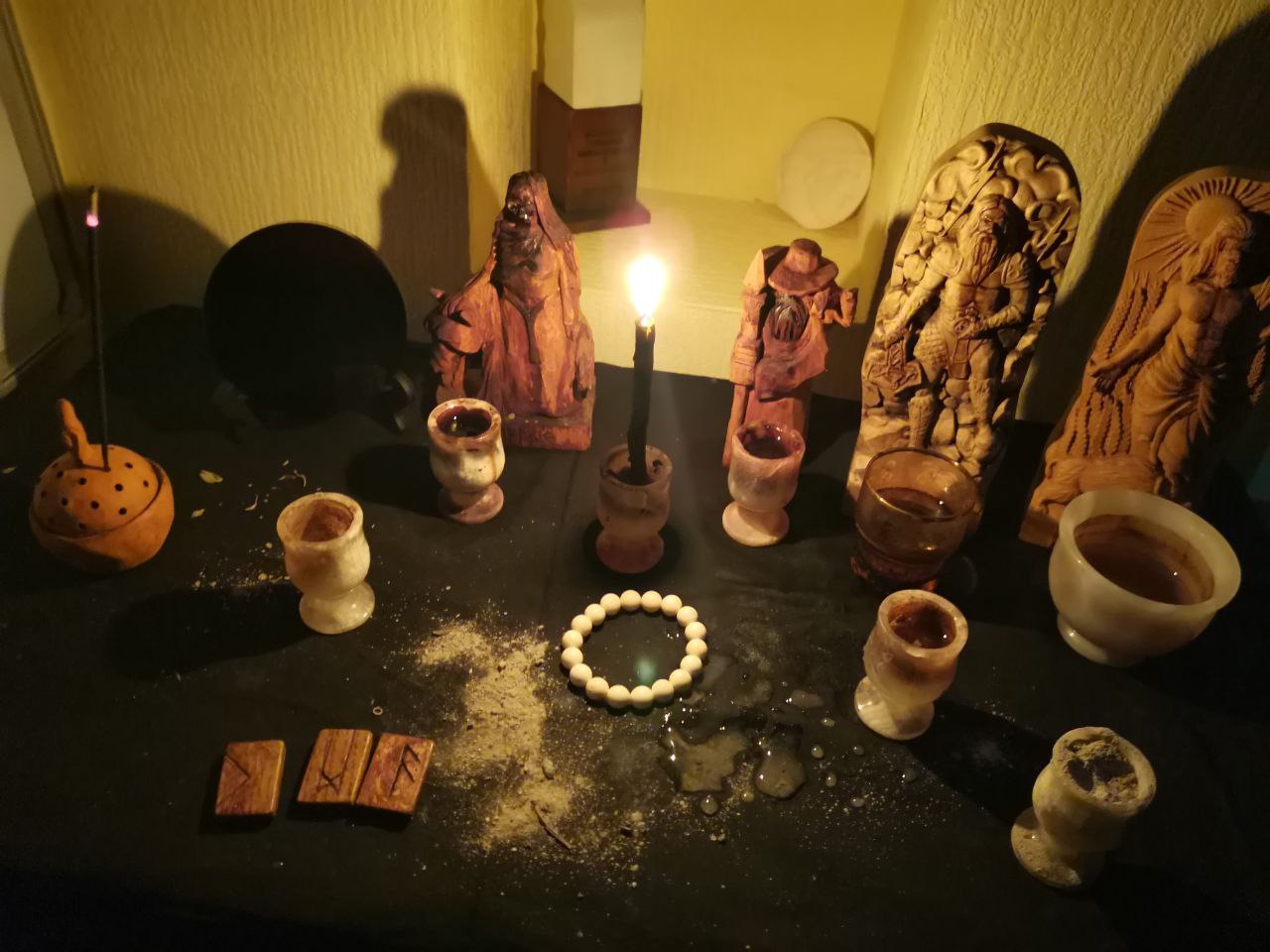 На работу брал свой бубен, походный алтарь и чуры. Проводил освящение вином, сделал подношения богам и духам места, а также заложил подклад в помещение.