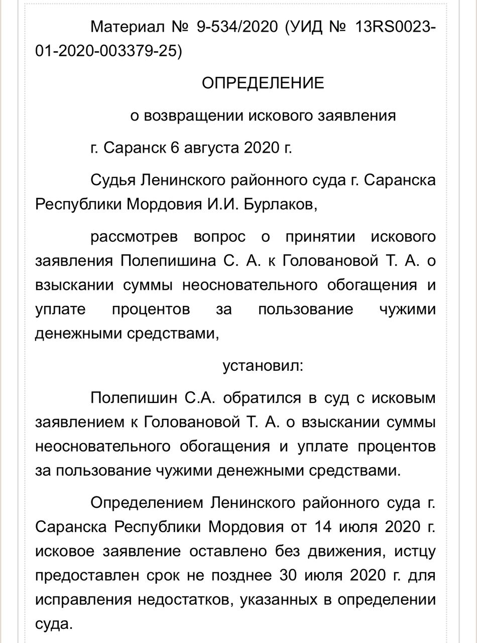 А вот иск на сотни тысяч рублей, который был подан к Татьяне самостоятельно другим дропом Маслова, Сергеем П, был возвращён заявителю в связи с тем, что он не устранил нарушения в отведенный срок.