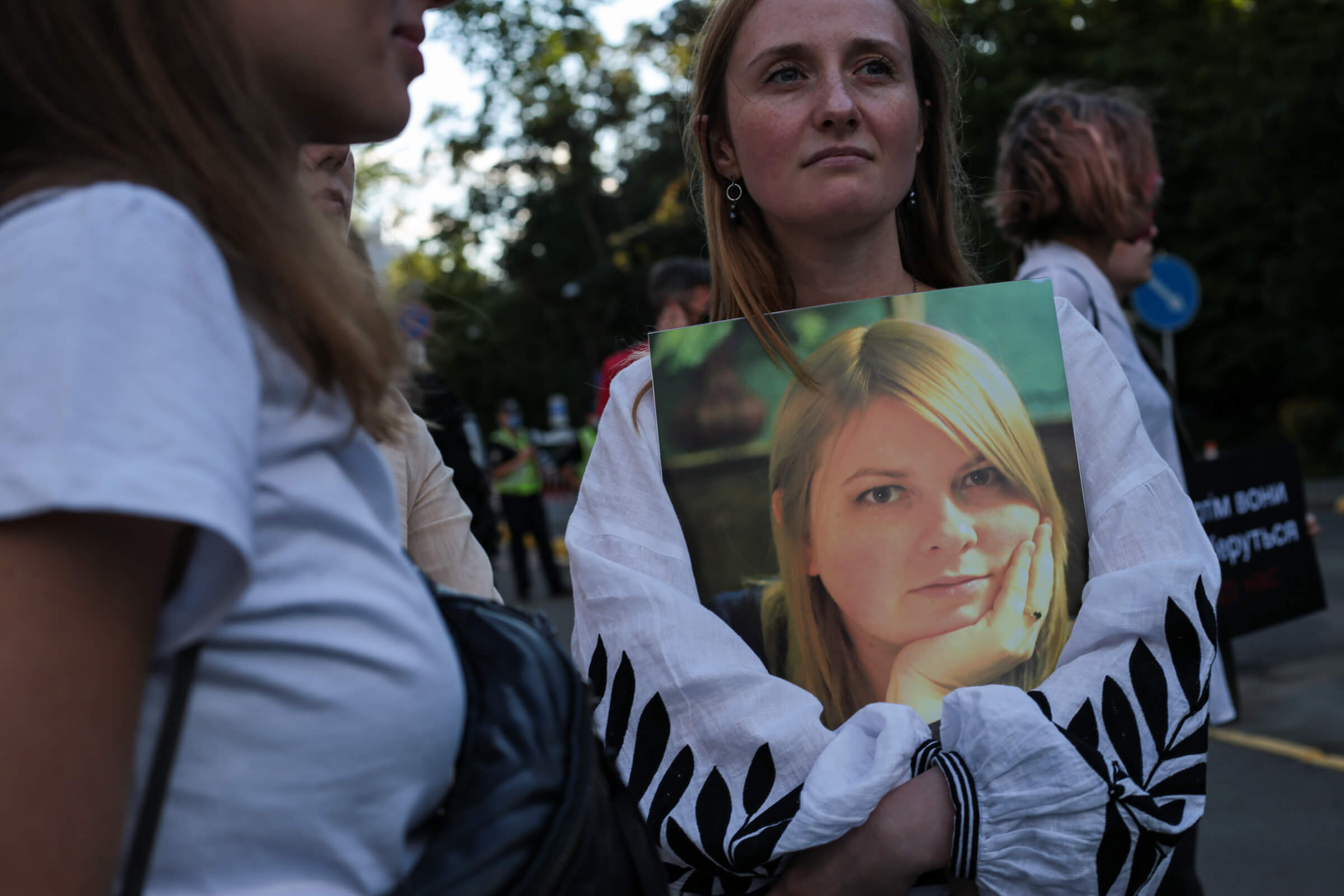 Активісти тримають портрет Катерини Гандзюк під час акції біля МВС України. Фото: Стас Юрченко, Ґрати