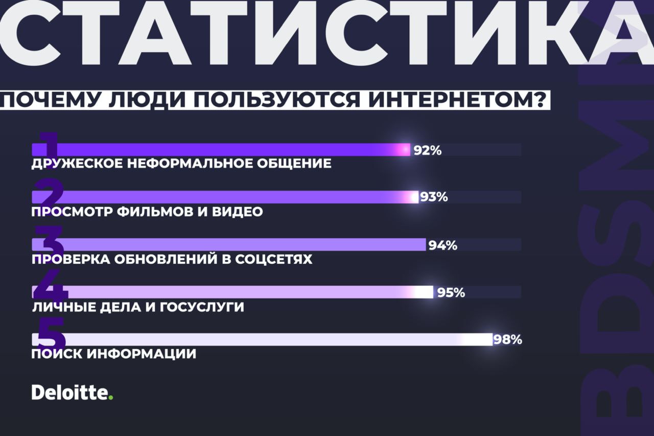 Поговорим про интернет. Статистика на выходные. Deloitte провел исследование и опубликовал данные 2020 года, поражающие своей точностью. В целом ничего особенного, просто держите в уме, что это год карантина и локдауна.