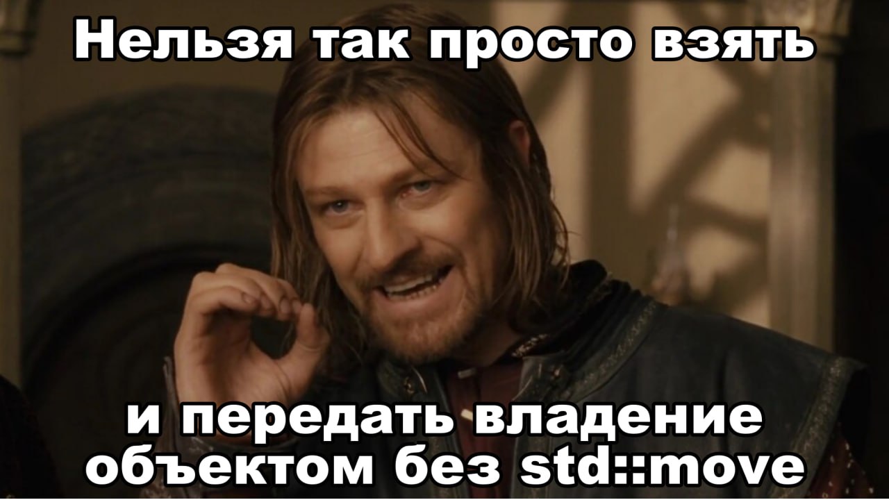 Еще одна вещь, которая подчеркивает передачу владения: moved-from объект практически никак в общем случае нельзя безопасно использовать, кроме как безопасно разрушить или переприсвоить(в комментах под прошлым постом более конкретно обсуждали этот момент). Даже если функция принимает rvalue reference, это не значит, что она не изменяет объект: возможно внутренние вызовы это делают.