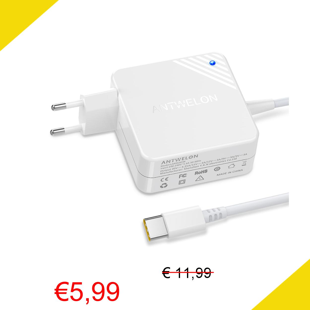 ANTWELON 65W USB C Alimentatore Caricabatterie per Lenovo Thinkpad Yoga, Asus, Macbook Pro, Dell Latitude Inspiron,HP Spectre, Acer Chromebook 20V 3,25A Type C Adattatore Notebook
