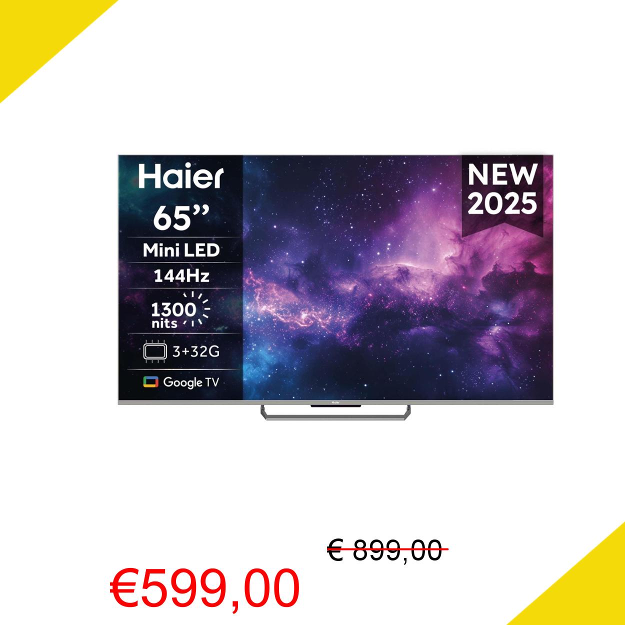 💥 Haier Mini LED 4K UHD M90EUX 65'' Smart TV, Google TV, Dolby Atmos e Dolby Vision, 144Hz, HDR 10, Google TV, Processore Quad Core, Bluetooth 5.1, DBX TV, HDMI 2.1 x 4 [2024]