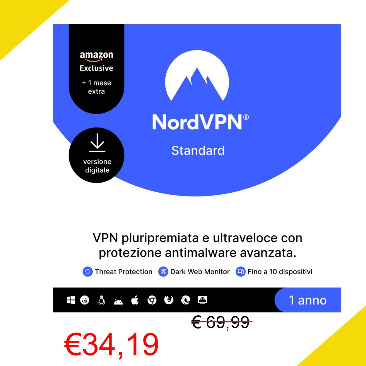💥 NordVPN Standard, Esclusiva Amazon, 10 Dispositivi, 1-Anno + 1 Mese Extra, Codice Digitale