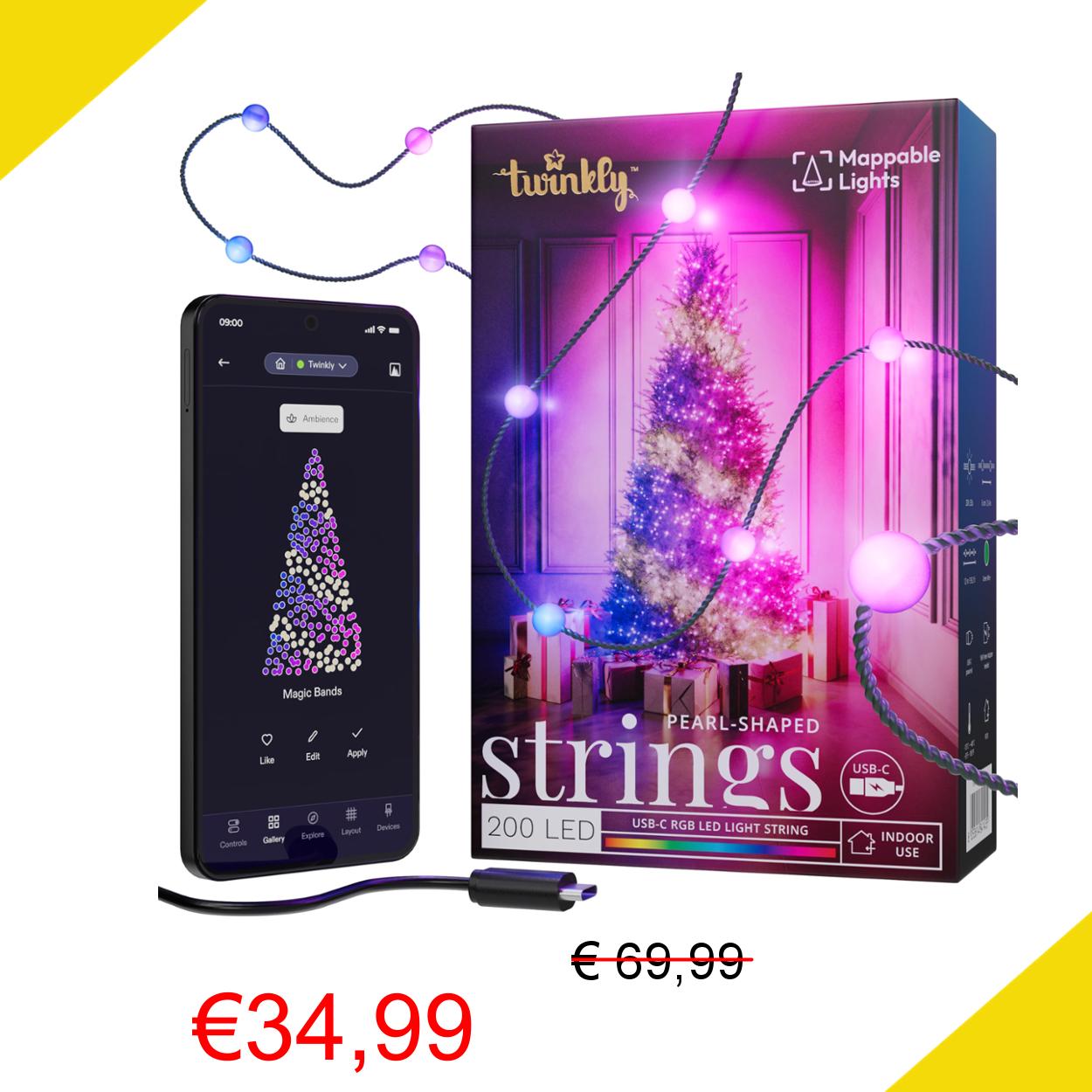 💥 Twinkly Strings USB-C Pearls 200 LED, Striscia Luci LED a Forma di Perla, Luci LED Multicolore RGB, Luci San Valentino, Compatibile con Alexa, Google Home, Luci Mappabili, USB C, Filo Verde, 12m