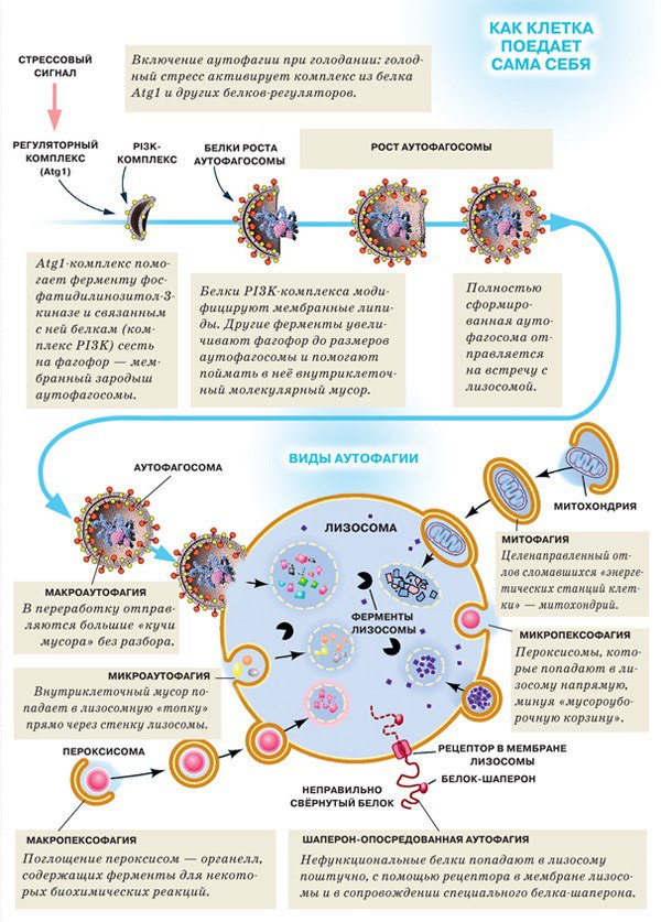 Говоря простыми словами, аутофагия - это процесс переработки клеткой собственных составляющих. Впервые описал бельгийский биохимик Кристиан Де Дюв в 1963 году. Но тогда учёный не знал, является ли эта способность клеток врожденной, какие гены за это отвечают и как запустить процесс. Лишь недавно, в 2016 году японский учёный Ёсинори Осуми смог экспериментально доказать этот процесс. Работая с клетками дрожжей, учёный содержал их без дополнительной подпитки - в среде с низким уровнем глюкозы. Было доказано, что при низкокалорийном питании цитоплазма клеток начинает активизироваться, в ней возникает большое количество пузырьков. Как оказалось, при недостатке пищи клетка начинает сама себя переваривать. При этом сначала клетка «съедает» старые и поврежденные структуры - скопления окисленных белков, дефектные митохондрии. В результате клетка обновляется и омолаживается.