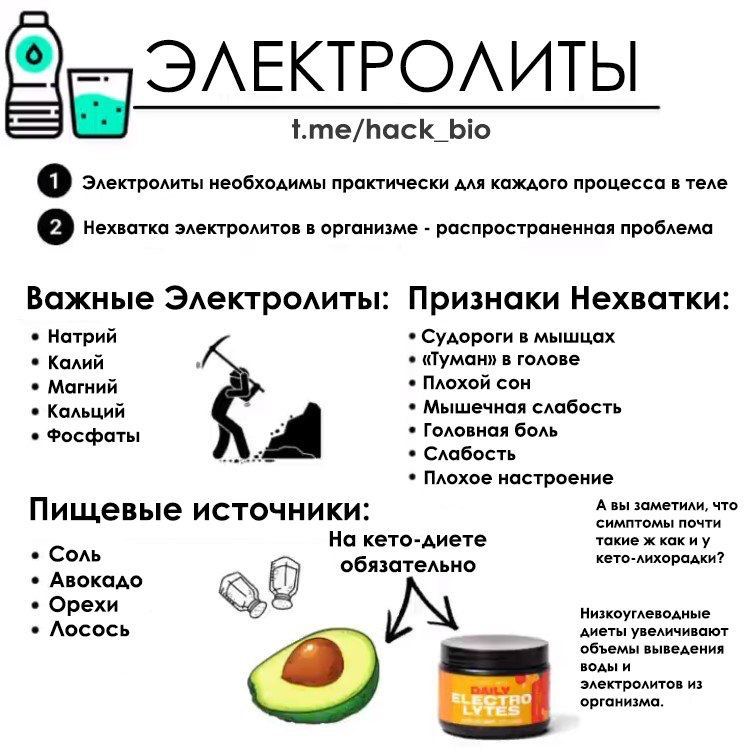 Не допускайте этого, получая достаточное количество электролитов, спланировав свой рацион таким образом, чтобы в него входили продукты, перечисленные на этой картинке (или включите в него пищевые добавки). Тем, кто придерживается кето-диеты или тем, кто много тренируется и обильно потеет, скорее всего, потребуется и то, и другое.