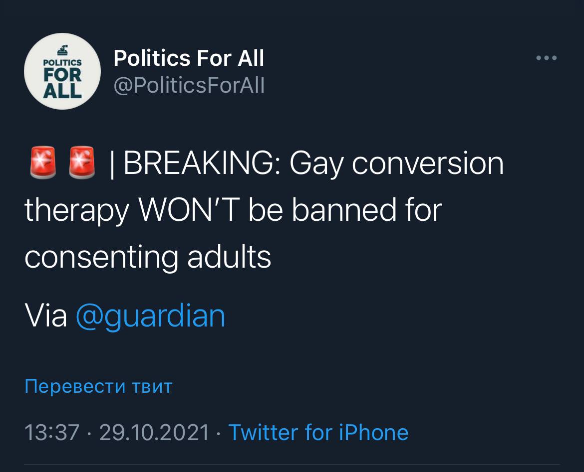 Зрозуміло, що в Британії немає ніякої насильницької конверсивної терапії (окрім хіба що в ісламських комьюніті), а значить тих, хто намагаються вилікуватись від хвороби залишать в спокої, як і тих хто надає таку терапію.