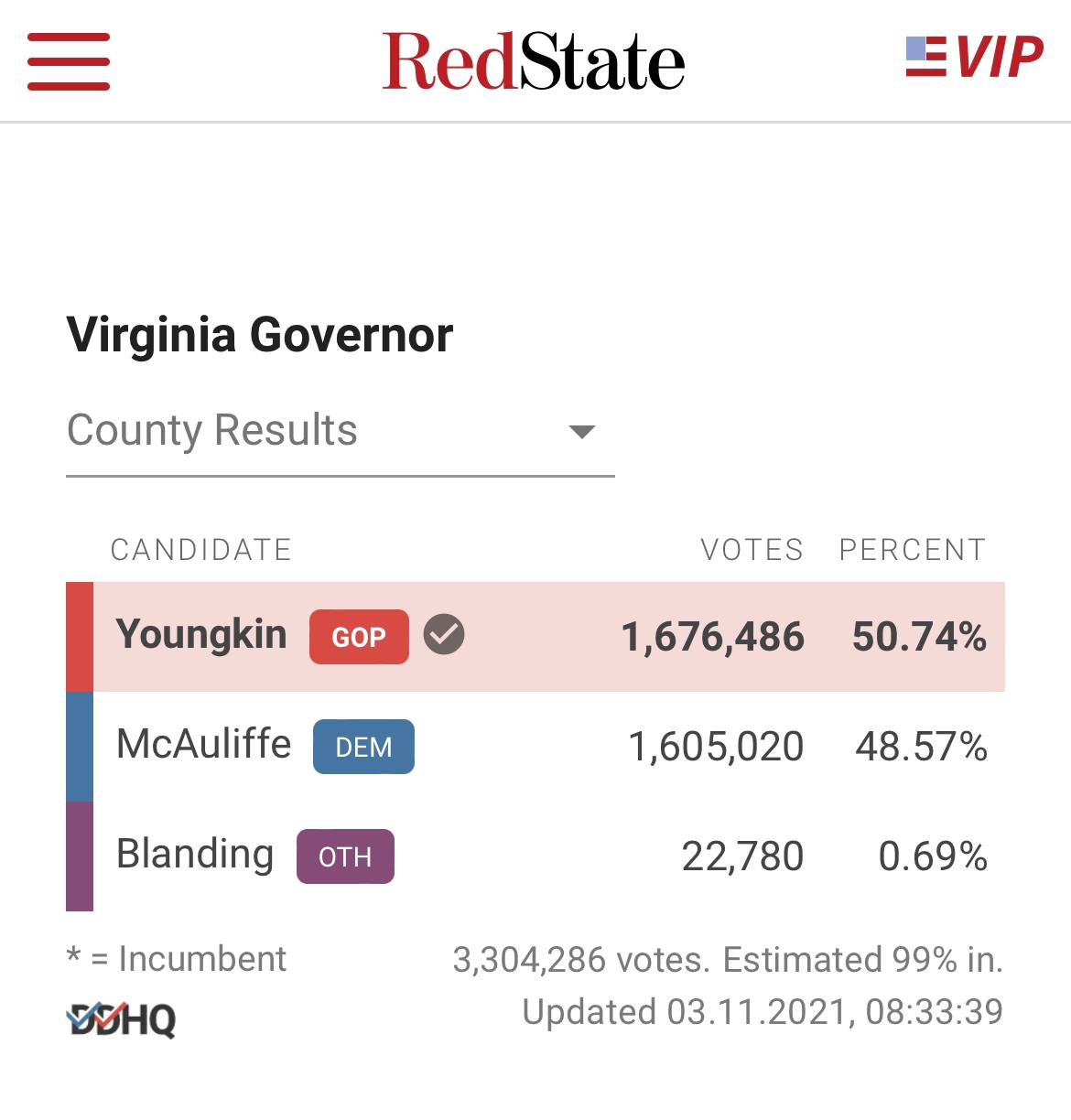 Янгкін переміг на виборах губернатора Вірджинії. Диво трапилось. Дем-машина не зуміла побороти розгніваних батьків Вірджинії. Клінтоновський посіпака Макколіфф може переїхати в Каліфорнію викладати критичну расову теорію і захищати трансвеститів - ґвалтівників.