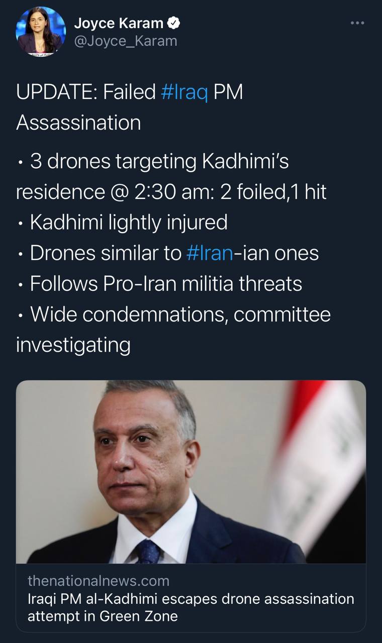 Іран намагався вбити прем‘єр-міністра Іраку за допомогою безпілотників. Аль-Казимі було поранено, але він живий.