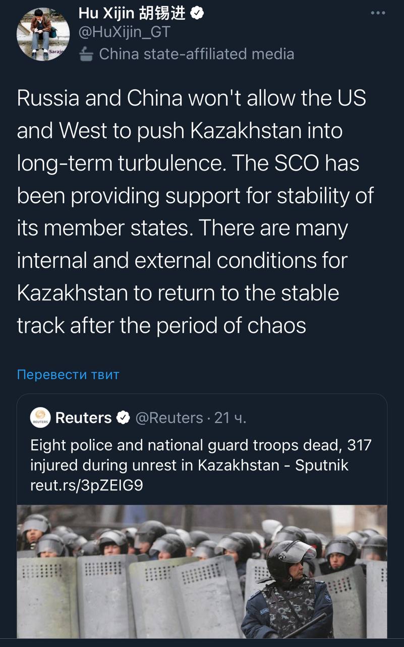 Відомий китайський журналіст Global Times (державного китайського виданння, через які Пекін шле меседжі) Ху Січжінь фактично підтверджує, що Москва та Пекін працюють разом над завершенням перевороту і пацифікацією казахів. Звісно це все завуальовано розповідями про коварний Захід, який дестабілізує ситуацію.