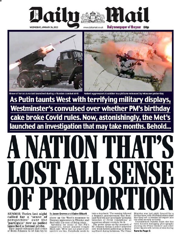 В той час як Путін брязькає зброєю і загрожує Європі війною, британці обговорюють вечірки прем‘єра і хто де ходив без масочки та їв торт під час череди нескінченних локдаунів.