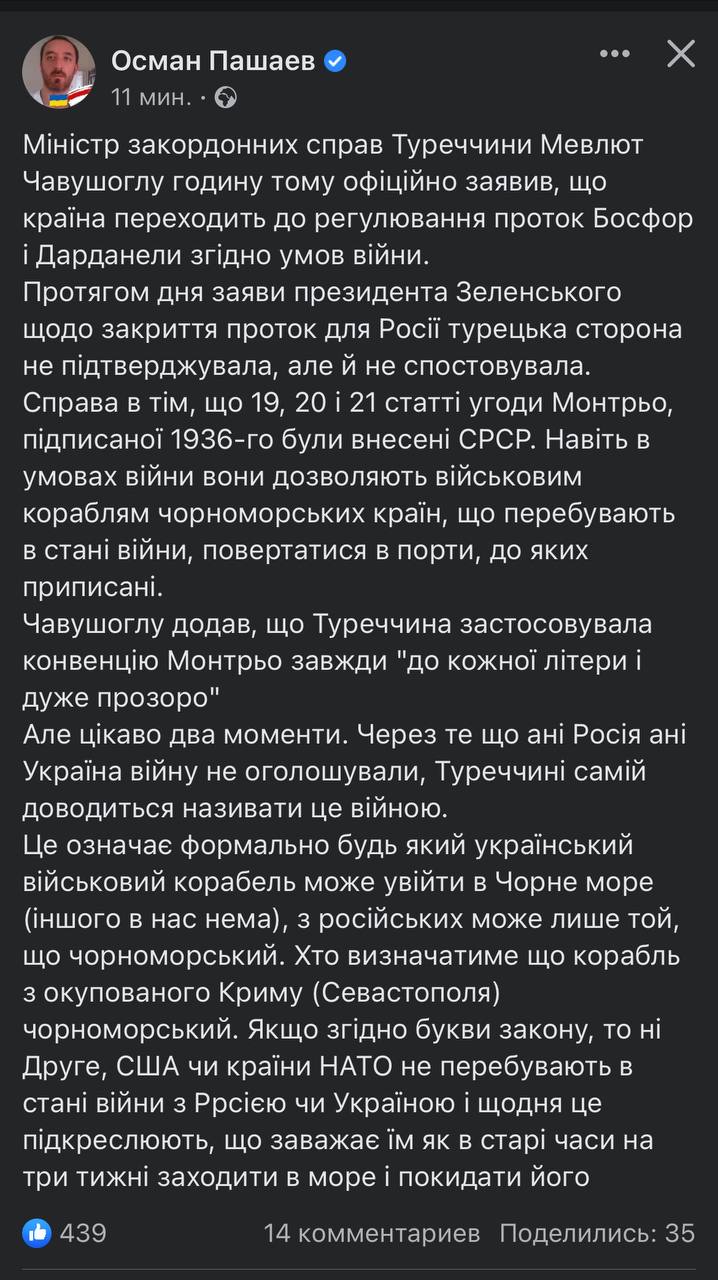 Туреччина закриває протоку. Але москальські кораблі, що дислоковані в Чорному морі можуть повертатись на бази згідно з Конвенцією Монтрьо