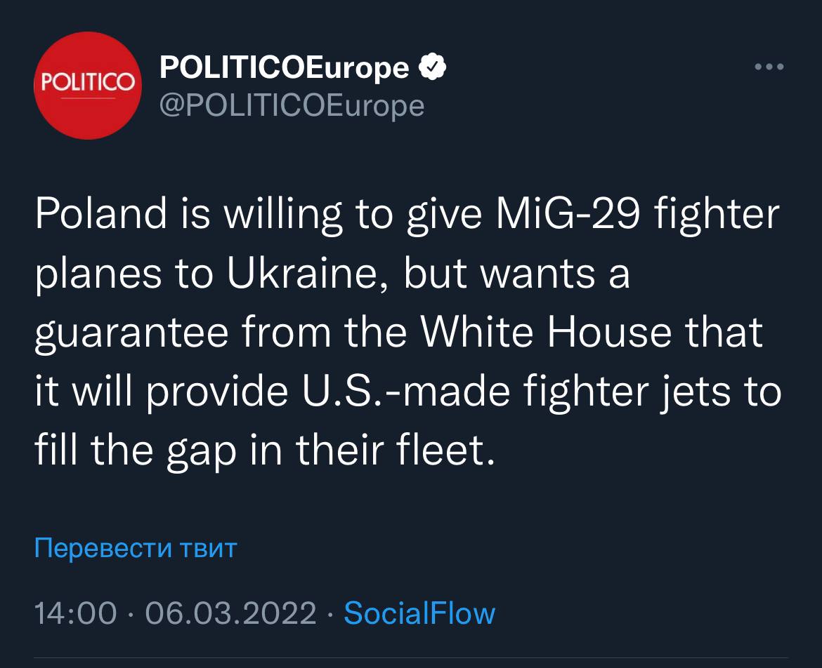 Польща готова передати Україні літаки, але хочуть гарантій від США, що вони поповнять польський флот своїми літаками