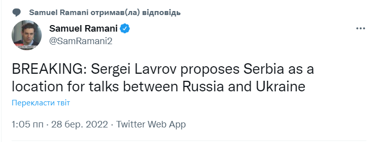 Лавров пропонує Сербію для перемовин між Україною та Росією. А може одразу Сирію чи КНДР? На хрін нам ваші васальні ушльопки серби?