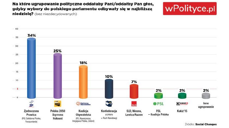 Лідером є консервативна партія "Право та Справедливість" з 34% підтримки населення.