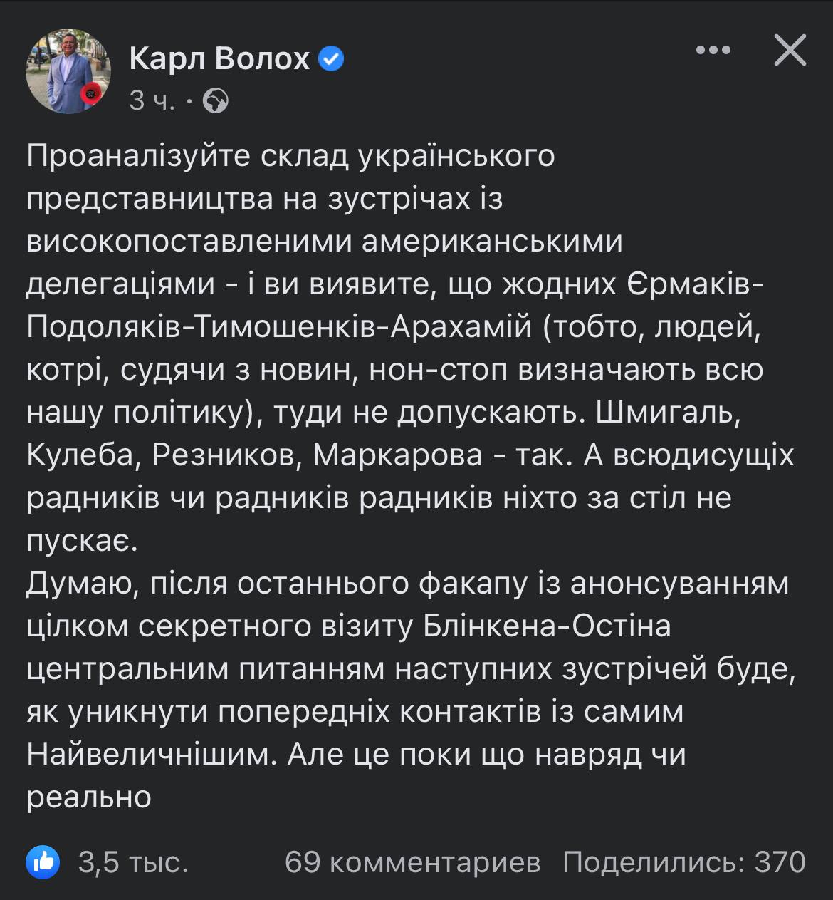 За нашим інсайдом, Ллойд Остін кинув на стіл перед Зеленський барсєтку і сказав: «Далі ми будемо зустрічатись тільки з делегацією у складі Карла Волоха, Тараса Чорновіла та Дмитра Чекалкіна. Крапка!»