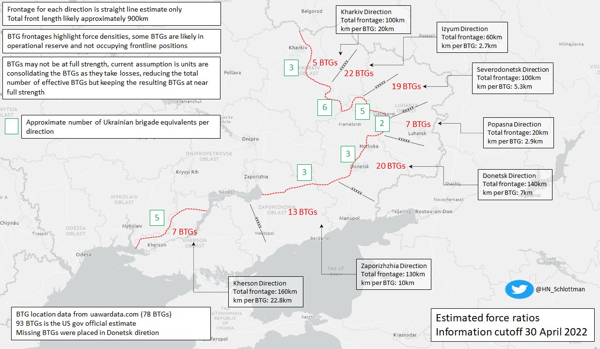 Знайшов цікаву карту Генрі Шлоттмана, де він зобразив приблизну кількість російських БТГ на кожному напрямі та їх концентрацію (км на БТГ) станом на 30 квітня