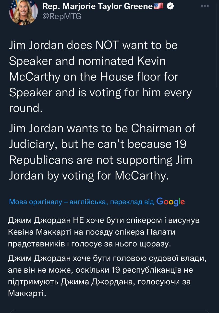 На хрін їх. Якщо Маккарті проповзе, він буде залежати від таких як Марджорі, якщо Джордану вдасться його підкилимний переворот, то у влади також буде цей блядо-цирк.