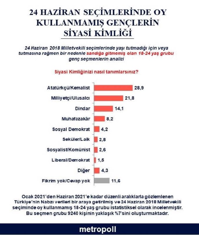 Цікава різниця з країнами Заходу. В Туреччині значно мала кількість молоді, які вважають себе соціал-демократами, соціалістами чи ліберальніми демократами. Якщо скласти соцдемів, секуляристів (кемалісти то теж секуляристи, я так розумію виокремили в окрему категорію істеричних борцунів за атеїзм), соціалістів і так званих "ліберальних демократів" то таких лише трохи більше 10%. На Заході молоді лівих поглядів не менше 50% в середньому