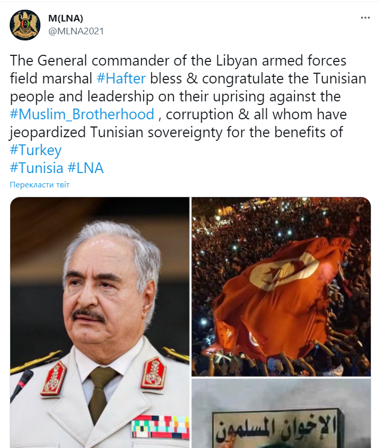 Французько-російська маріонетка і заколотник Халіфа Хафтар вітає переворот в Тунісі і ще щось вякає про суверенітет.