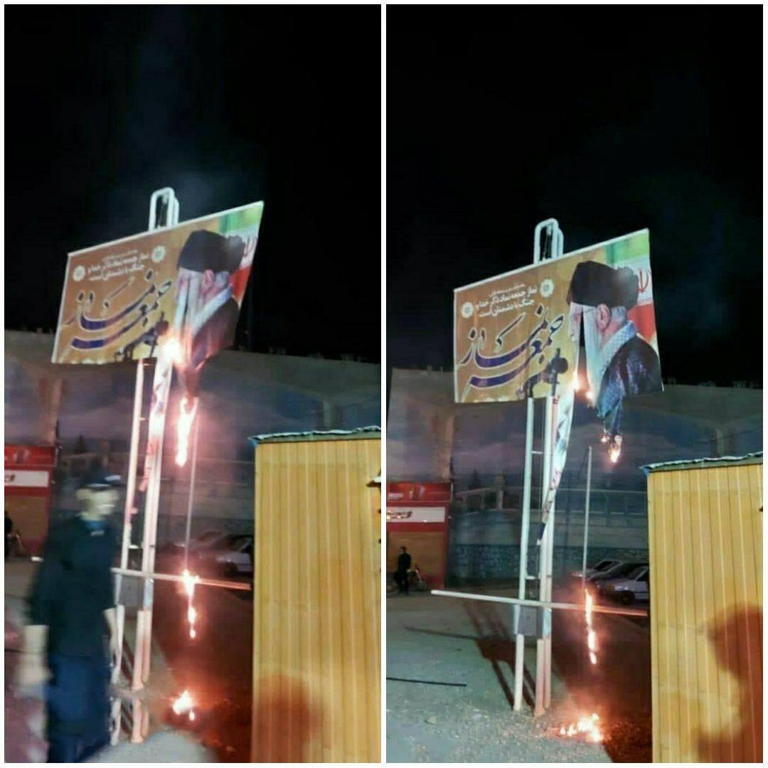 Під час протестів в місті Ісфахан, іранці підпалили плакат із зображенням та цитатами аятолли Хаменеї