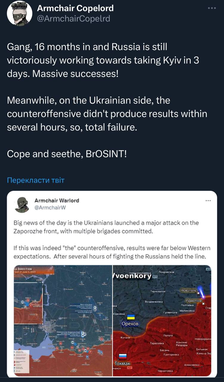 5. Інші телеграм канали що співпрацюють з військовими радісно скачуть на одній ножці, ура, через підрив каховської дамби позиції ЗСУ на островах підтоплює, ЗСУ намагаються евакуюватись і спаситись, далі публікують радісні відоси, як вони наносять ураження позицій наших хлопців на островах. 08:25 Посилання https://archive.ph/c0iHL