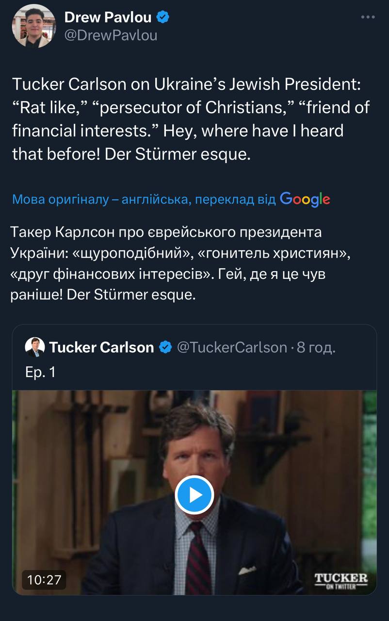 Давайте більш серйозно прокоментую висер Такера та його промоушн Ілоном Маском. Хоча я вже більше року тим займаюсь, що стверджую про корозію консервативного руху в США, небезпеку таких осіб як Трамп, Маск, Такер, не дивлячись на те, що ще знаходяться унікуми, які їх захищають, розповідають про "політичні переслідування", а ми винні в тому, що "мало працюємо" з Такером Карлсоном та божевільним культом Трампа (щоб це не значило).