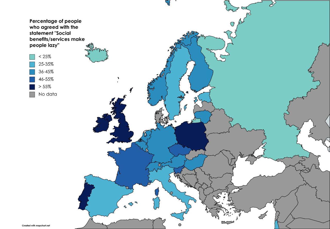 Кількість людей, які згодні з твердженням, що «соціальна допомога робить людей ледачими».