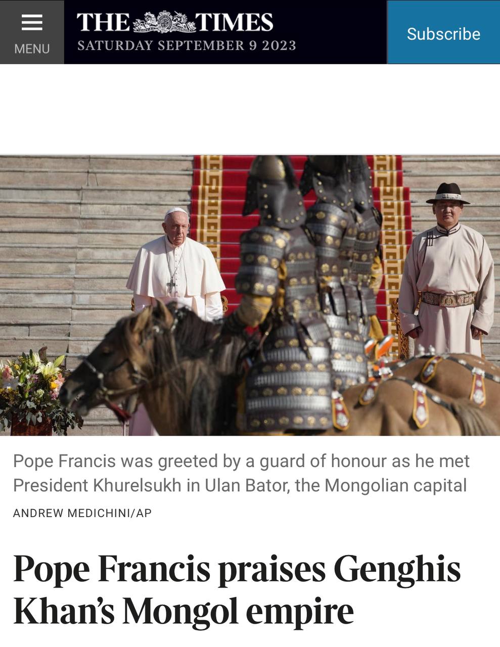 Папа Римський за останній тиждень вихваляє дві імперії: Монгольську і Російську. Об'єднує їх те, що ці імперії не мають жодного вкладу в цивілізацію, а були лише імперіями побудованими на голому насиллі та підкоренні.