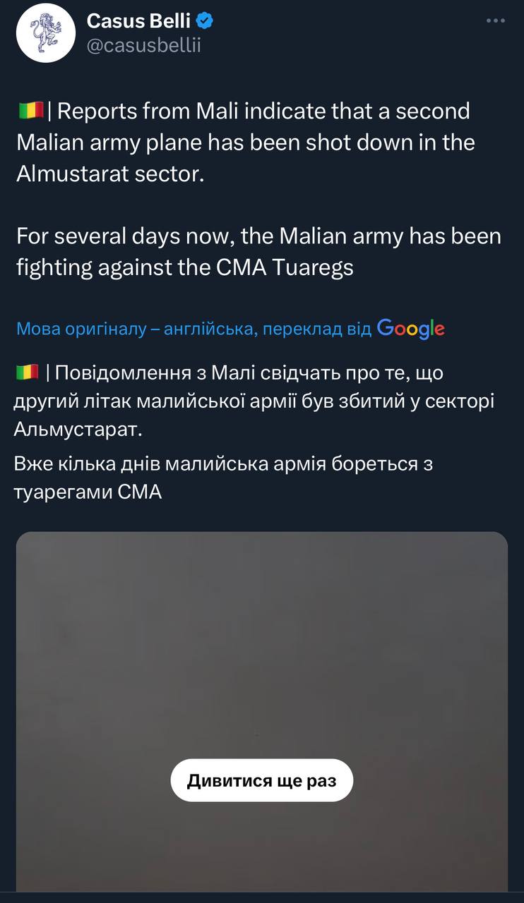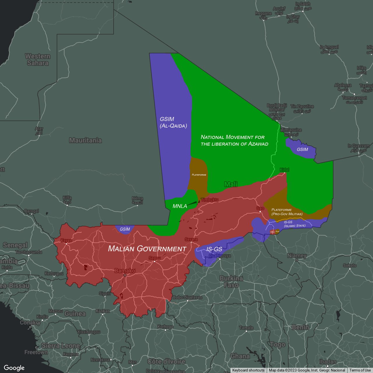 В Малі тим часом відновилась громадянська війна. Декілька днів тому туареги з Національного руху звільнення Азаваду оголосили, що розривають Алжирську мирну угоду (укладену у 2015 році) з урядом країни. Вони атакували місто Бурем і взяли його під контроль. Вони зараз контролюють значні частини Півночі країни. Також значні території контролюють ісламісти- Північному Заході африканське відділення Аль-Каїди, а на Західному Півдні - ІДІЛ.